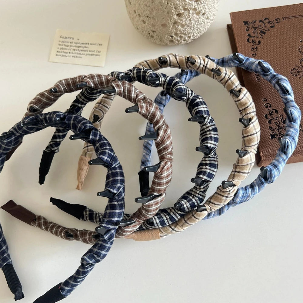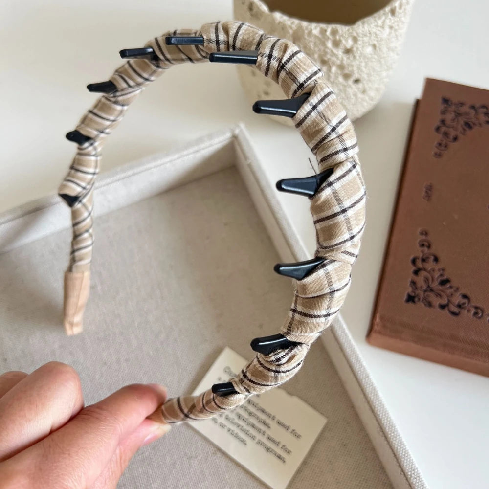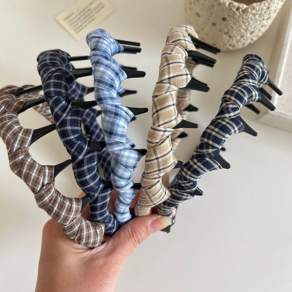 Tired of headbands that slide off? This is your solution. The integrated comb teeth grip your hair gently but firmly, preventing slipping whether you're working, studying, or just going about your day. The top features a soft, ruched plaid fabric for a touch of timeless, textural style.