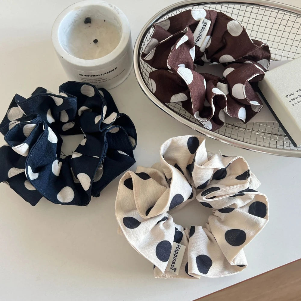 A timeless classic, reimagined. Our Oversized Polka Dot Scrunchie adds a touch of retro, playful charm to any look. Crafted from a soft, lightweight fabric and finished with a delicate ruffle, this 4.3-inch scrunchie is designed to make a statement. It provides a strong, all-day hold that's gentle on your hair, perfect for creating a voluminous high ponytail or a chic, effortless bun.