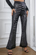 Medium-weight woven shapes these trendy pants, covered entirely with an array of shiny sliver sequins, that have a high, elastic waist (with a pull-on design) and a figure hugging fit until they flare out at ankle-length hems. Pair with a casual top and ankle strap heels for the ultimate groovy look!