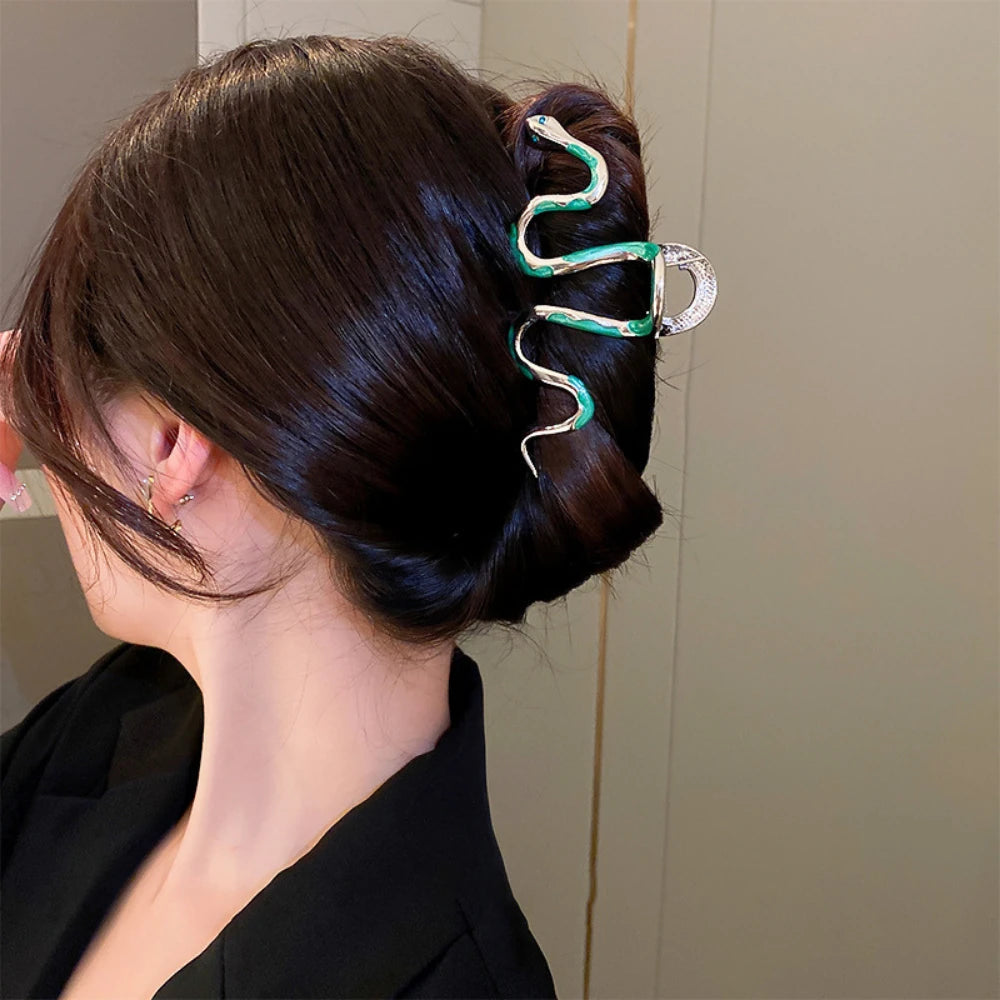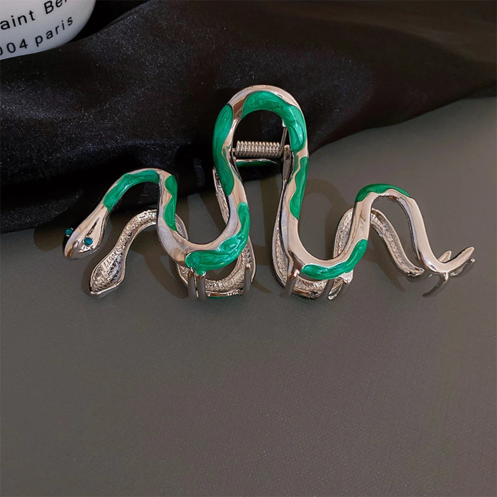 Unleash your inner goddess with this captivating Serpent Hair Claw. This is not just a hair clip; it's a piece of wearable art. Crafted from a substantial, polished silver-tone alloy, this 4.7-inch clip features a sinuous snake design, detailed with vibrant green enamel scales and a sparkling, rhinestone-encrusted head. It's designed to make a statement, adding a touch of edgy elegance and mysterious allure to any updo. The strong grip and large size make it perfect for securing thick hair with confidence.
