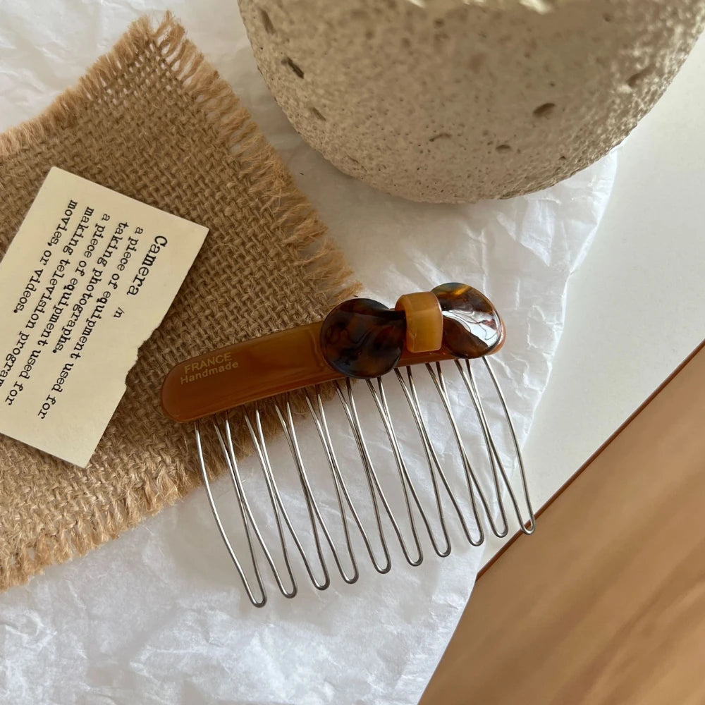 The elegant bow top is crafted from high-quality, durable cellulose acetate, featuring beautiful, timeless patterns. The 2.75-inch (7cm) wide metal comb base is designed to glide smoothly into your hair, providing a secure, all-day hold for bangs, flyaways, or a chic side-swept style.
