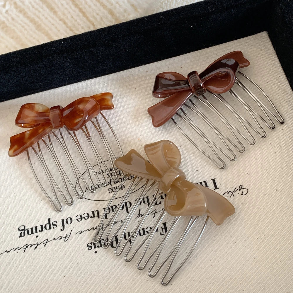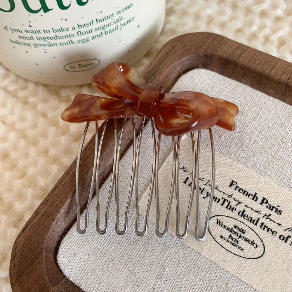 The elegant bow top is crafted from high-quality, durable cellulose acetate, featuring beautiful, timeless patterns. The 2.25-inch (5.7cm) wide metal comb base is designed to glide smoothly into your hair, providing a secure, all-day hold for bangs, flyaways, or a chic side-swept style.
