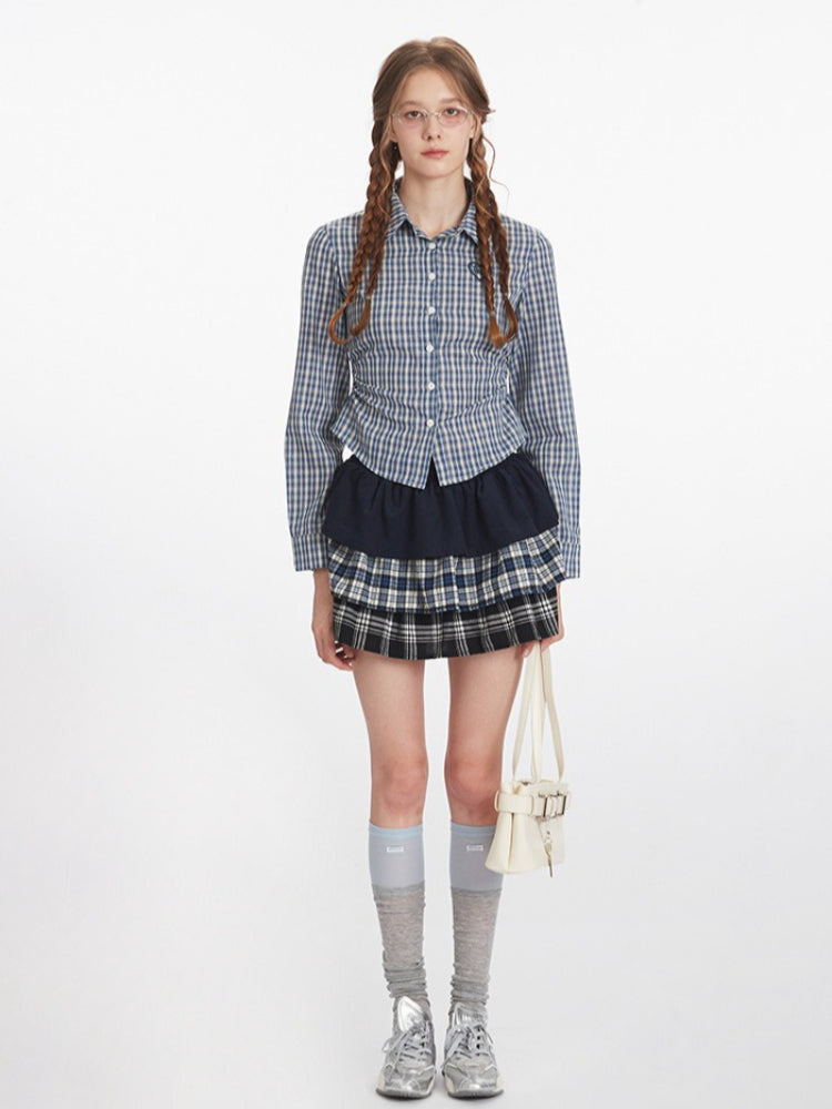 Channel your inner main character with this Vintage Blue Plaid Ruched Shirt. Perfectly balancing the Geek Chic and Y2K Preppy aesthetics, this top gives off an effortlessly smart yet stylish vibe.