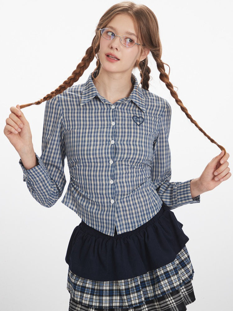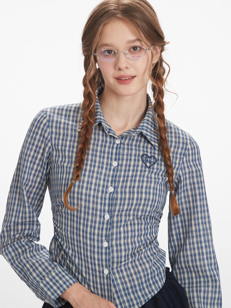 Unlike a standard flannel, this piece is designed with a feminine, figure-flattering cut. It features subtle side ruching that cinches the waist for a slimming effect. The look is finished with a sweet heart-shaped embroidery on the chest, adding a touch of playful romance to the classic blue and cream plaid pattern.
