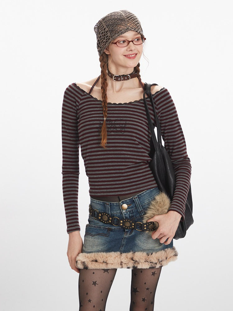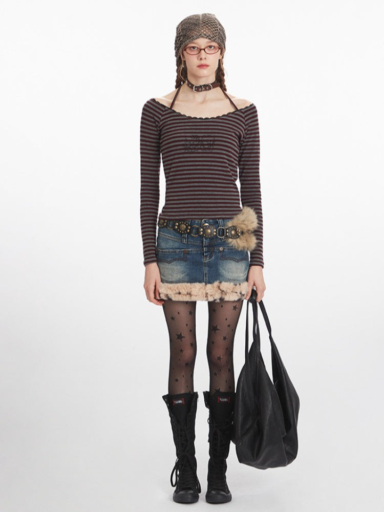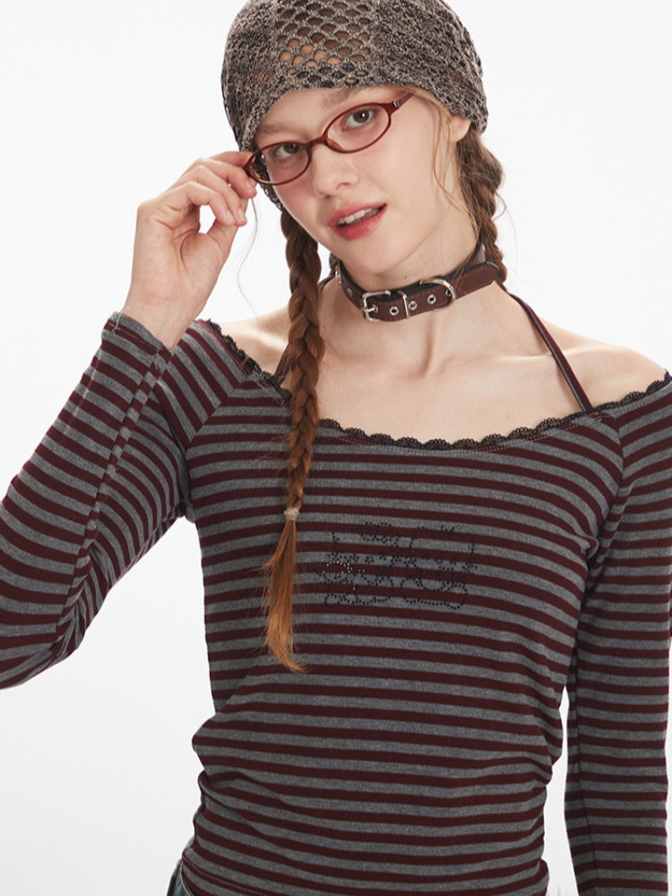 The top features a daring off-shoulder neckline secured by a chic halter neck tie, creating a "cold shoulder" look that highlights the collarbones. The moody burgundy and charcoal horizontal stripes give it that authentic grunge feel, while the slim, stretchy fit ensures it hugs your curves in all the right places.