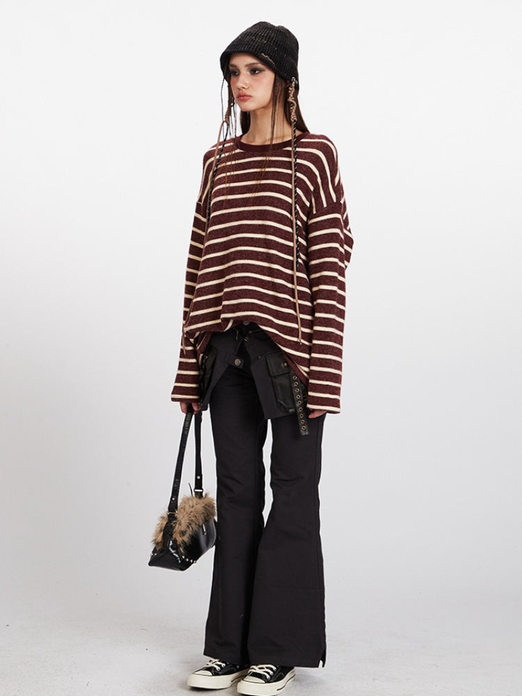 Your search for the ultimate "borrowed from the boyfriend" tee ends here. This Vintage Burgundy Striped Long Sleeve Top captures the effortless, slouchy energy of 90s grunge fashion.