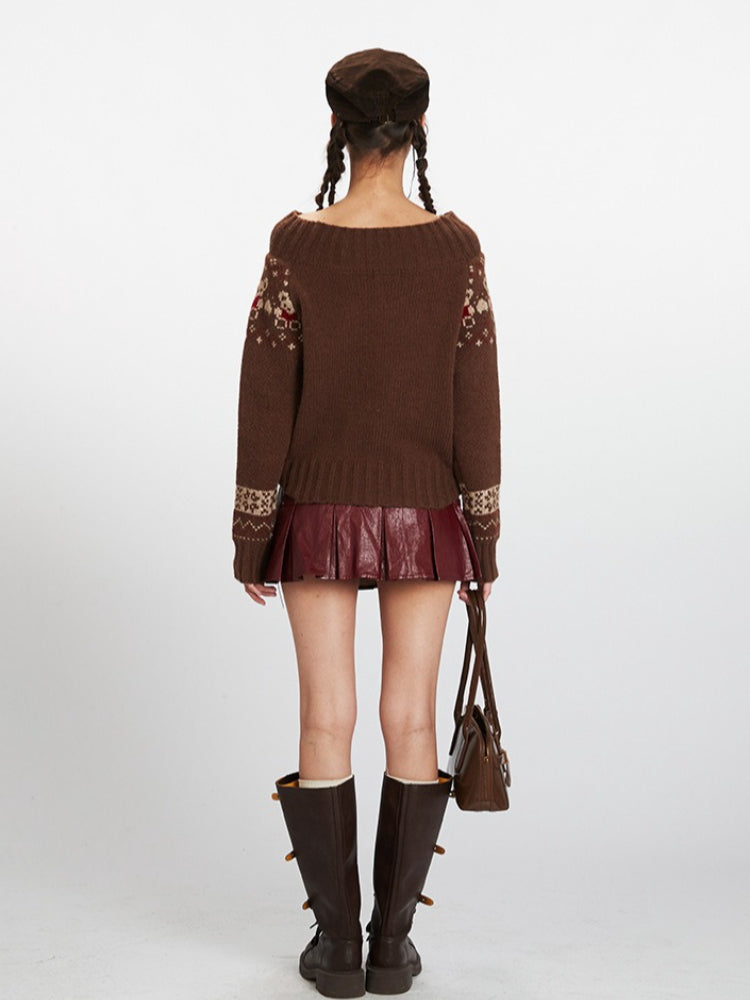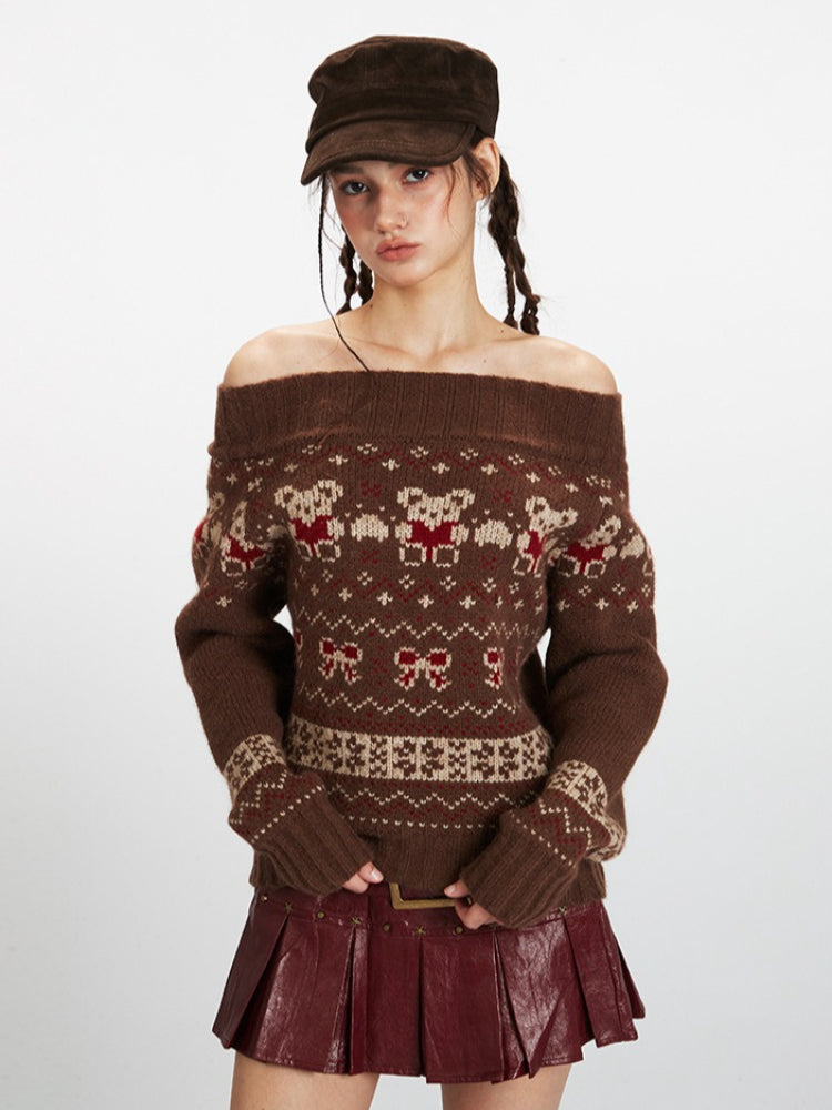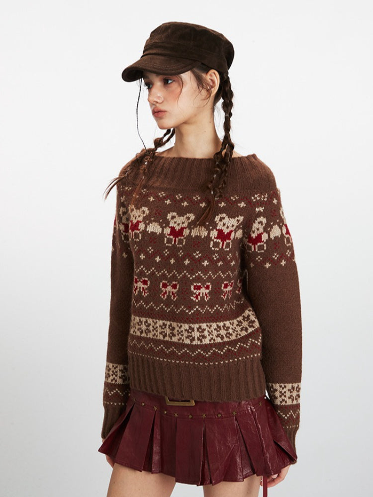 The design features a charming Fair Isle pattern adorned with adorable teddy bears and dainty red bows, set against a warm mocha brown backdrop. Its flattering off-shoulder (boat neck) silhouette allows for a touch of skin, balancing coziness with feminine allure. Crafted from a soft, mid-weight knit, it pairs flawlessly with pleated mini skirts and knee-high boots for that quintessential "Gilmore Girls" inspired look.