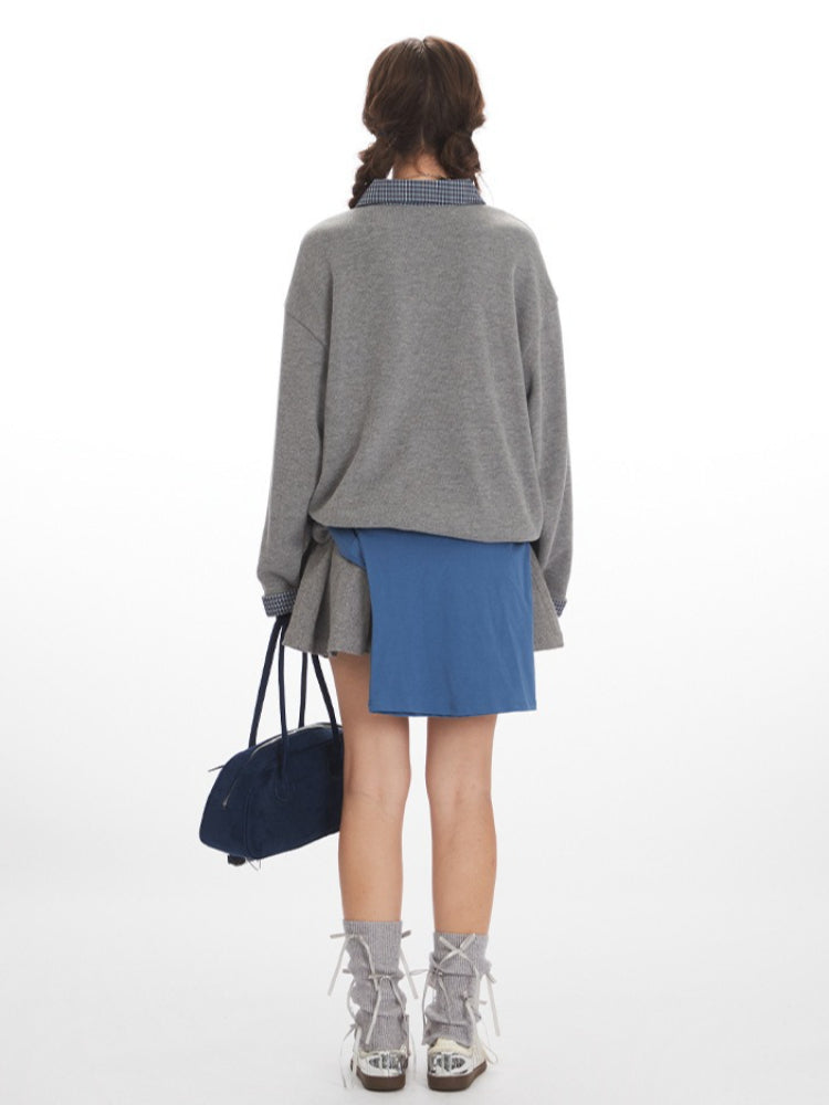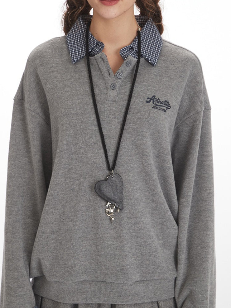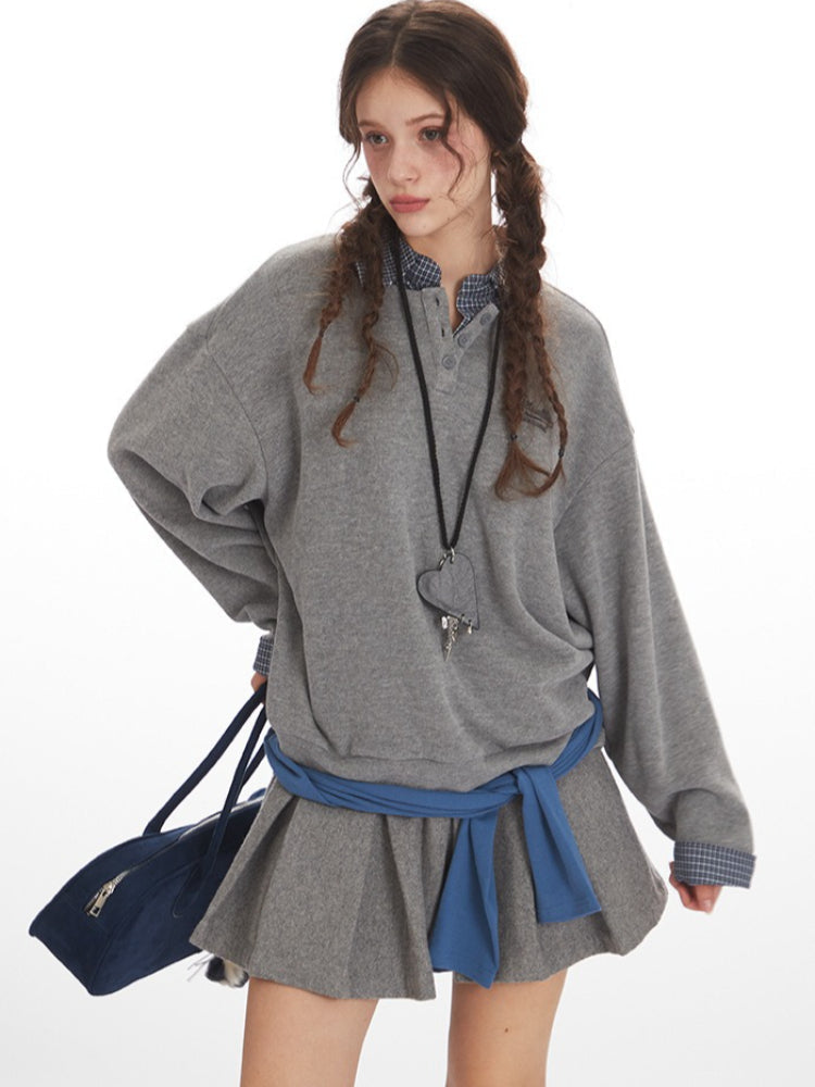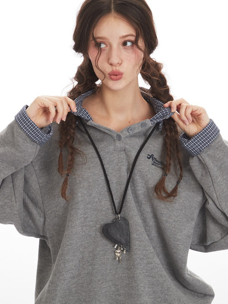 Designed with a clever "fake two-piece" construction, it features a crisp plaid collar emerging from a slouchy, oversized grey pullover. Whether you're heading to the library or a coffee date, this piece delivers that perfect "I woke up like this" intellectual charm found in Old Money casual trends.