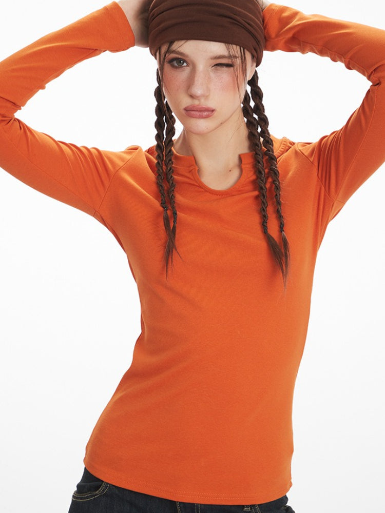 The defining feature is the subtle notch neckline (split neck), which adds a modern architectural detail to the classic long-sleeve silhouette. Crafted from a high-stretch, soft-touch fabric, it fits close to the body, making it an ideal layering piece under denim jackets or oversized blazers.
