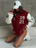 Channel the ultimate cool-girl aesthetic with this Vintage Red Sherpa Varsity Jacket. Merging the classic collegiate silhouette with the cozy texture of winter teddy fleece, this piece is a streetwear staple reimagined for comfort. The bold "19 21" chenille patches and contrasting sleeves give it a retro varsity feel, while the plush faux shearling fabric keeps you incredibly warm. Throw it over a mini skirt or baggy jeans for a look that is equal parts sporty and chic.