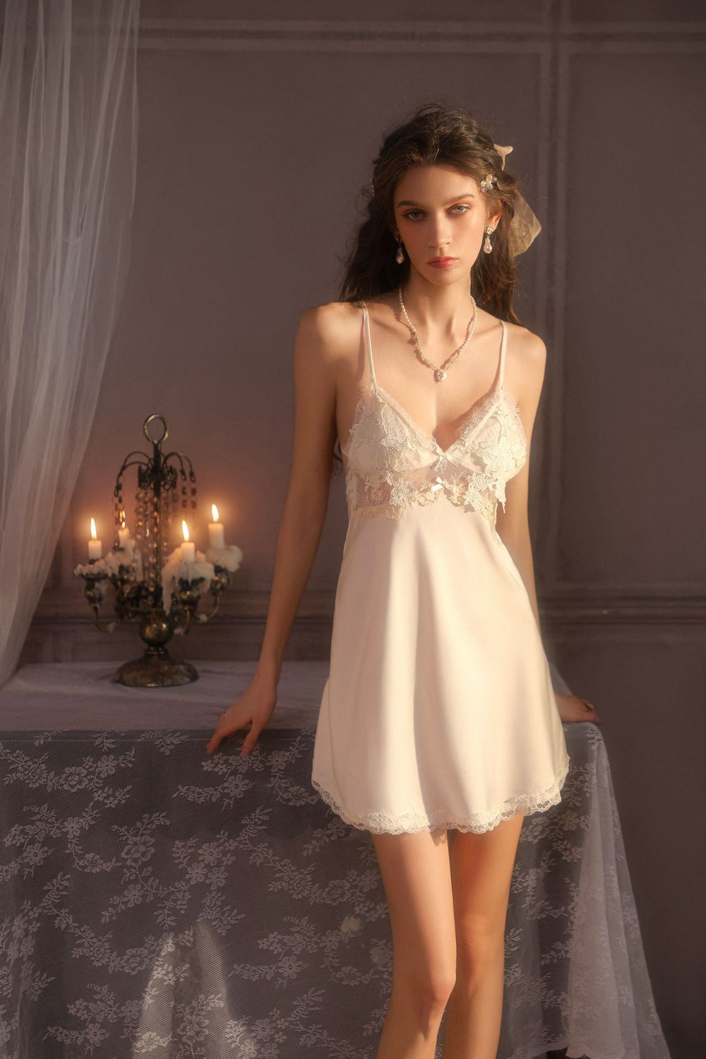 Step into a fairytale with our Ethereal Blossom Satin Sleepwear Set. This exquisite two-piece ensemble defines the "Pure Desire" aesthetic, featuring stunning 3D floral lace appliqués that bloom across the bodice, creating a texture that is both visually captivating and irresistibly soft.