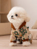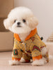 Turn your pet into a street-style icon with this Yellow Graffiti Hooded Pet Jumpsuit. This "cool kid" outfit features a trendy yellow fabric with a monogram-style graffiti print, contrasted by vibrant orange cuffs and a hood. The showstopper is the large, 3D plush bear doll attached to the back, dressed in its own green sweater and beanie hat, making every walk a photo opportunity.